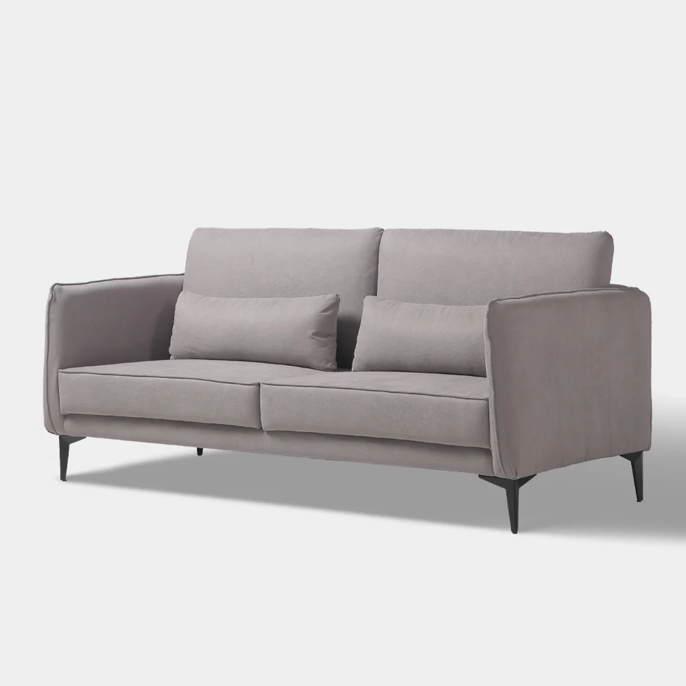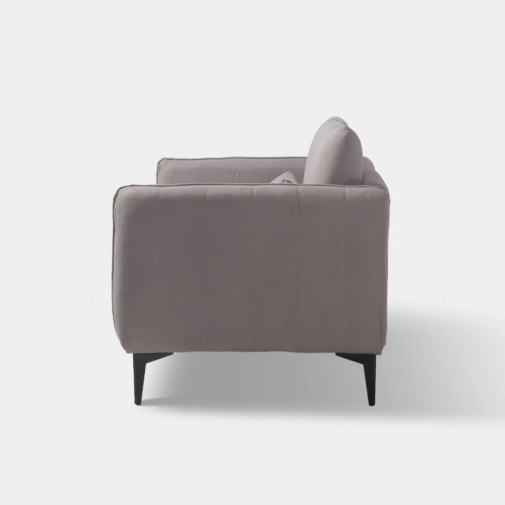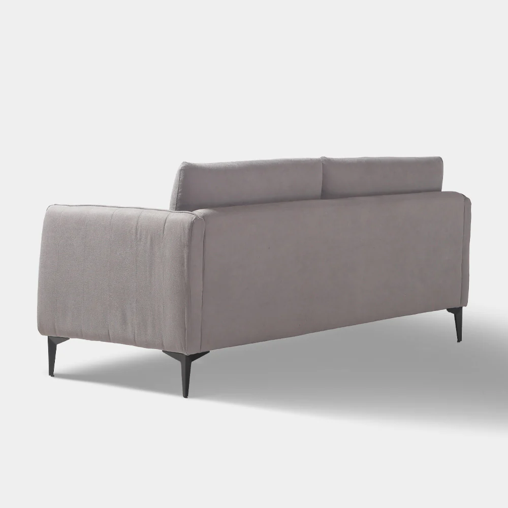 A Modern Contemporary style sectional sofa, made from solid kiln dried gmelina wood, padded in polyurethane foam and upholstered in chennile textured fabric, with black powder coated steel legs.