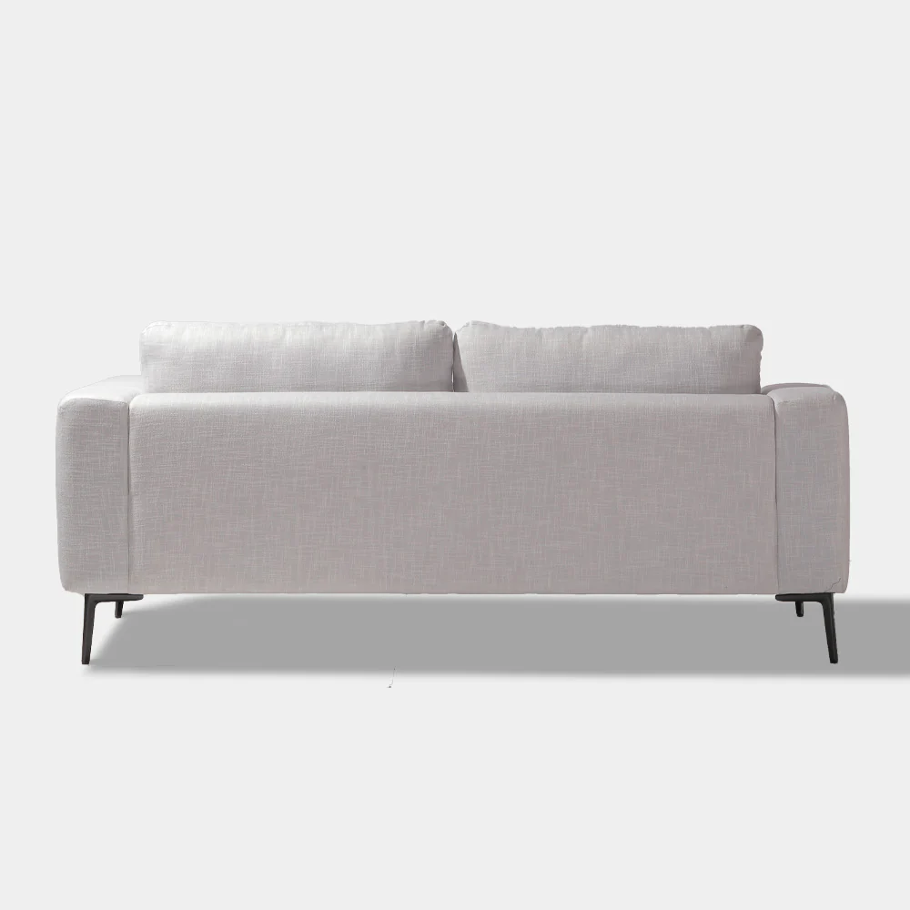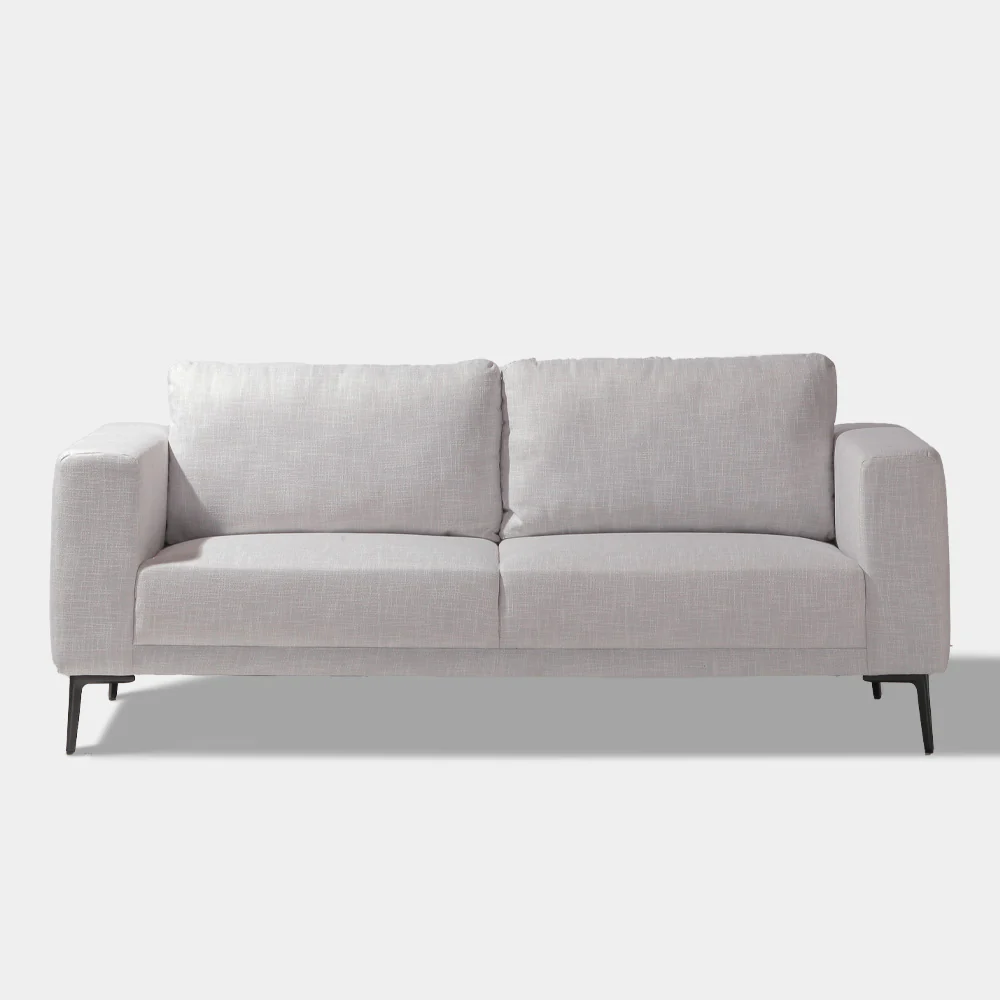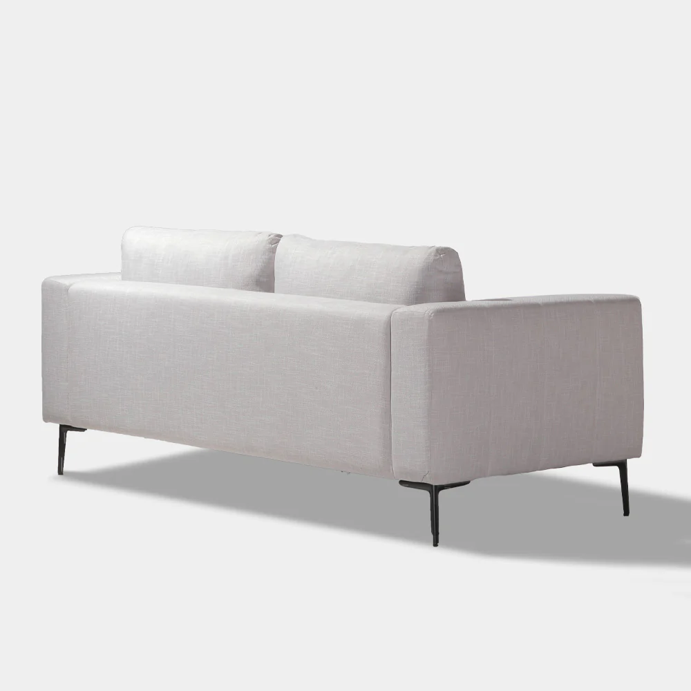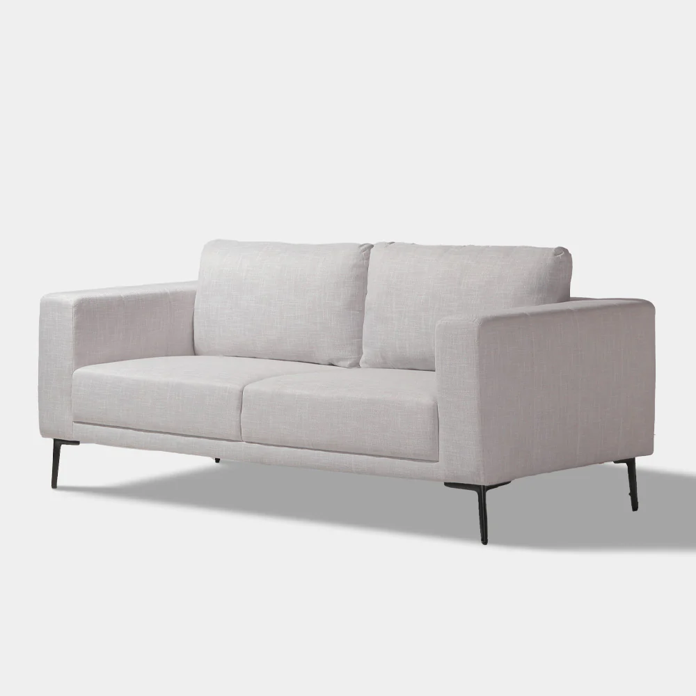 A Modern Contemporary style sofa, made from solid kiln dried gmelina wood, padded in polyurethane foam and upholstered in chennile textured fabric, with black powder coated steel legs.