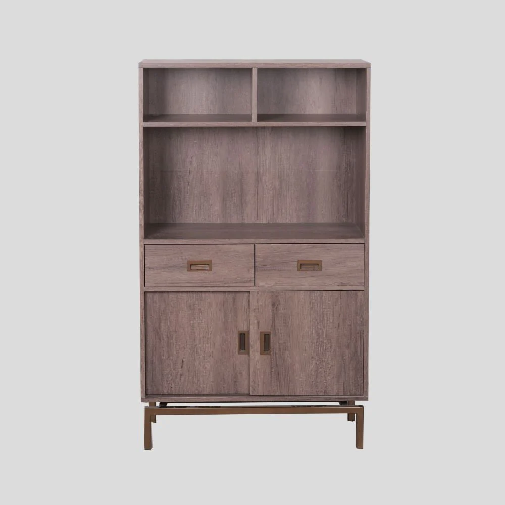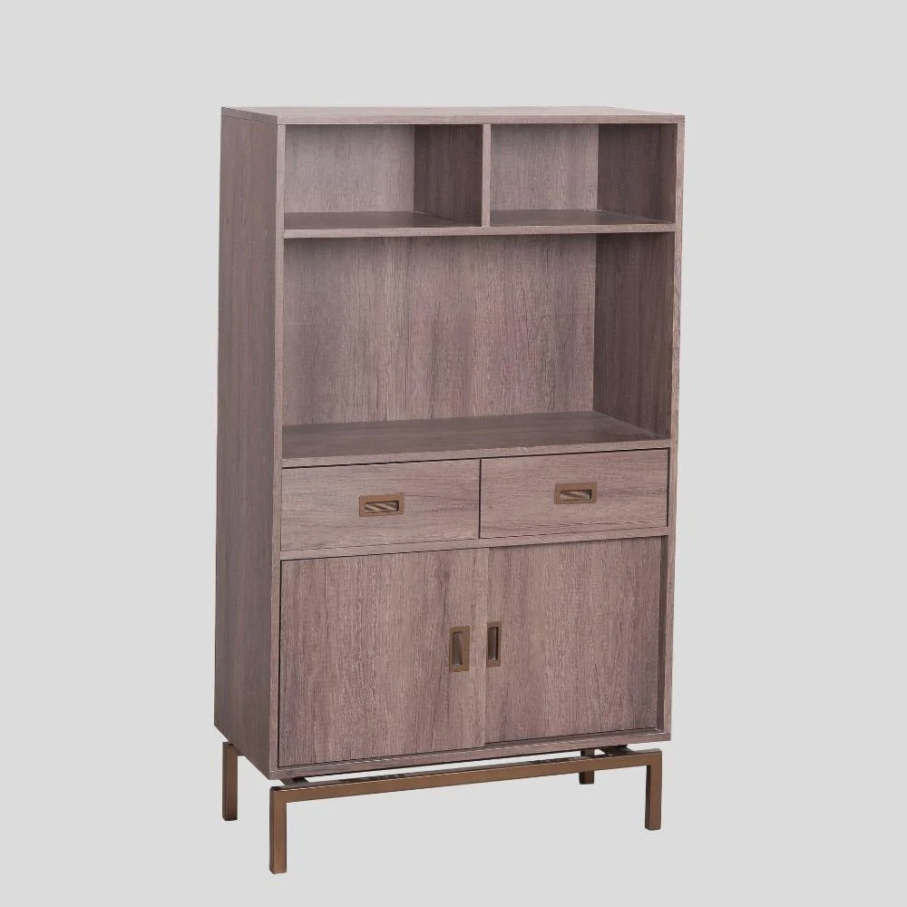 A Modern Contemporary shelving with drawers made from medium density fiber board, laminated with imported PVC vinyl, and has square tubular metal legs painted with antique gold powder finish.