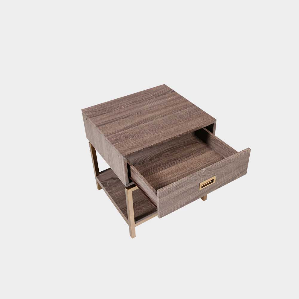 A Modern Contemporary side table with drawers made from medium density fiber board, laminated with imported PVC vinyl, and has square tubular metal legs painted with antique gold powder finish.