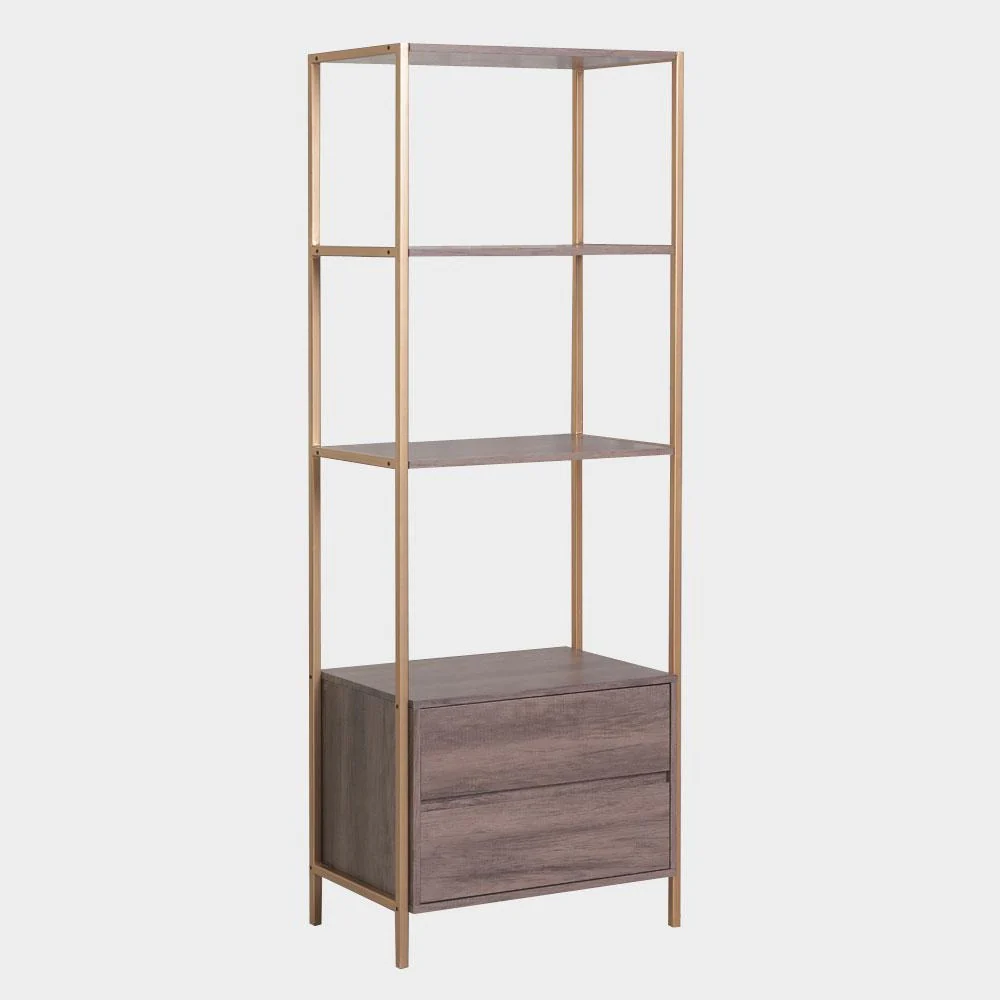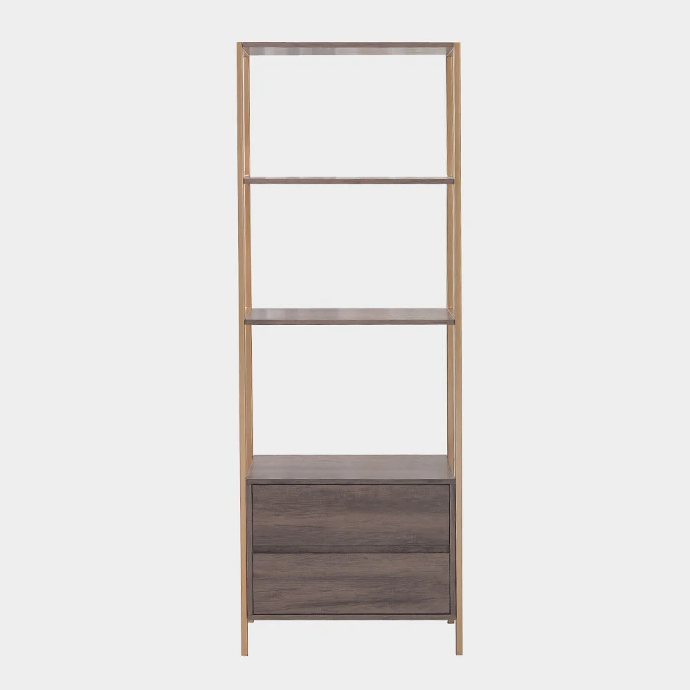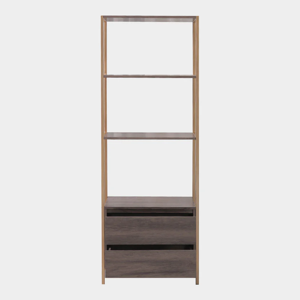 A Modern contemporary shelving with drawers made from medium density fiber board, laminated with imported vinyl and legs in metal antique gold finish.