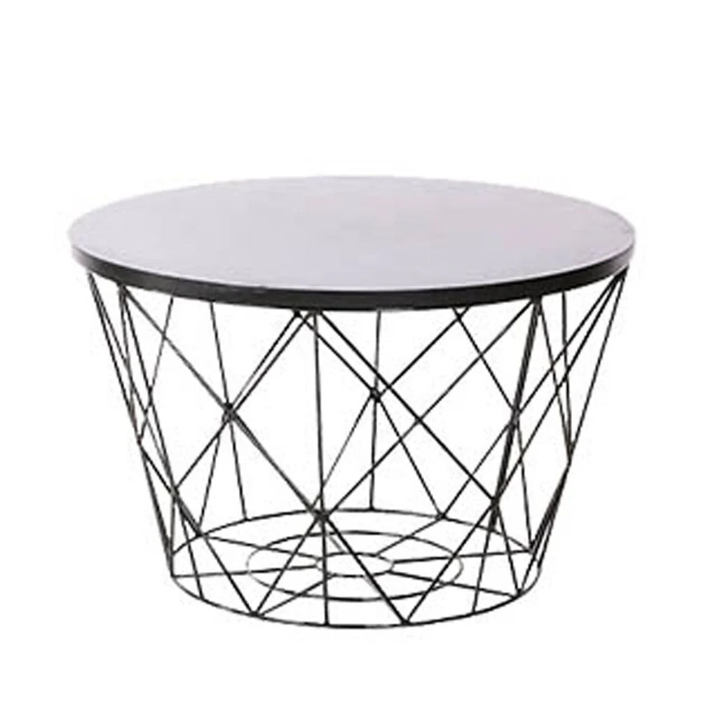 An Industrial round center table with geometrical solid wire metal base with laminated top.