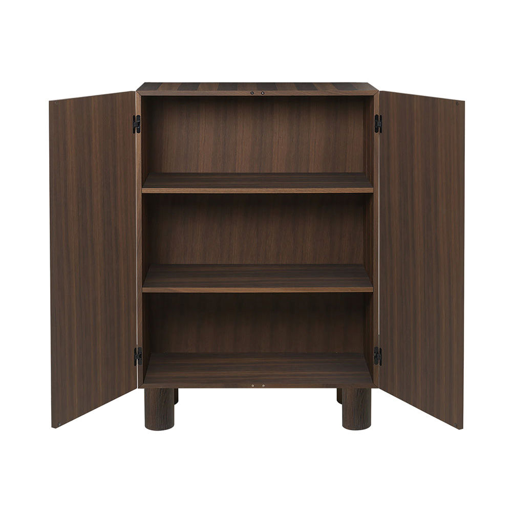the Post Storage Cabinet plays with volumes to present a remarkable storage solution with elaborate details that draw you in. Made from Mix-certified wood, the cabinet feature striped wood.