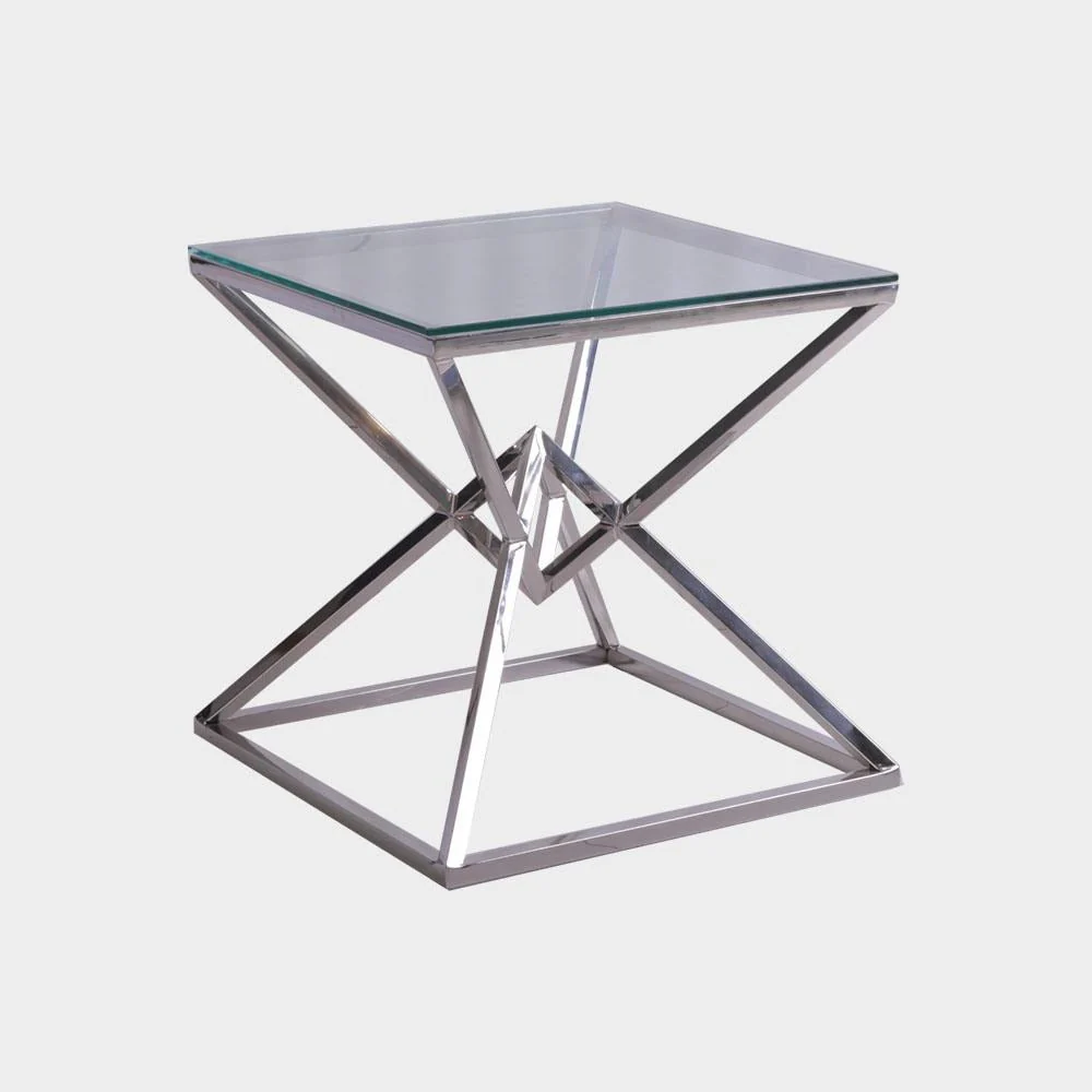 A Modern Contemporary side table in glass and sleek metal frame Tempered glass top with metal frame and legs.
