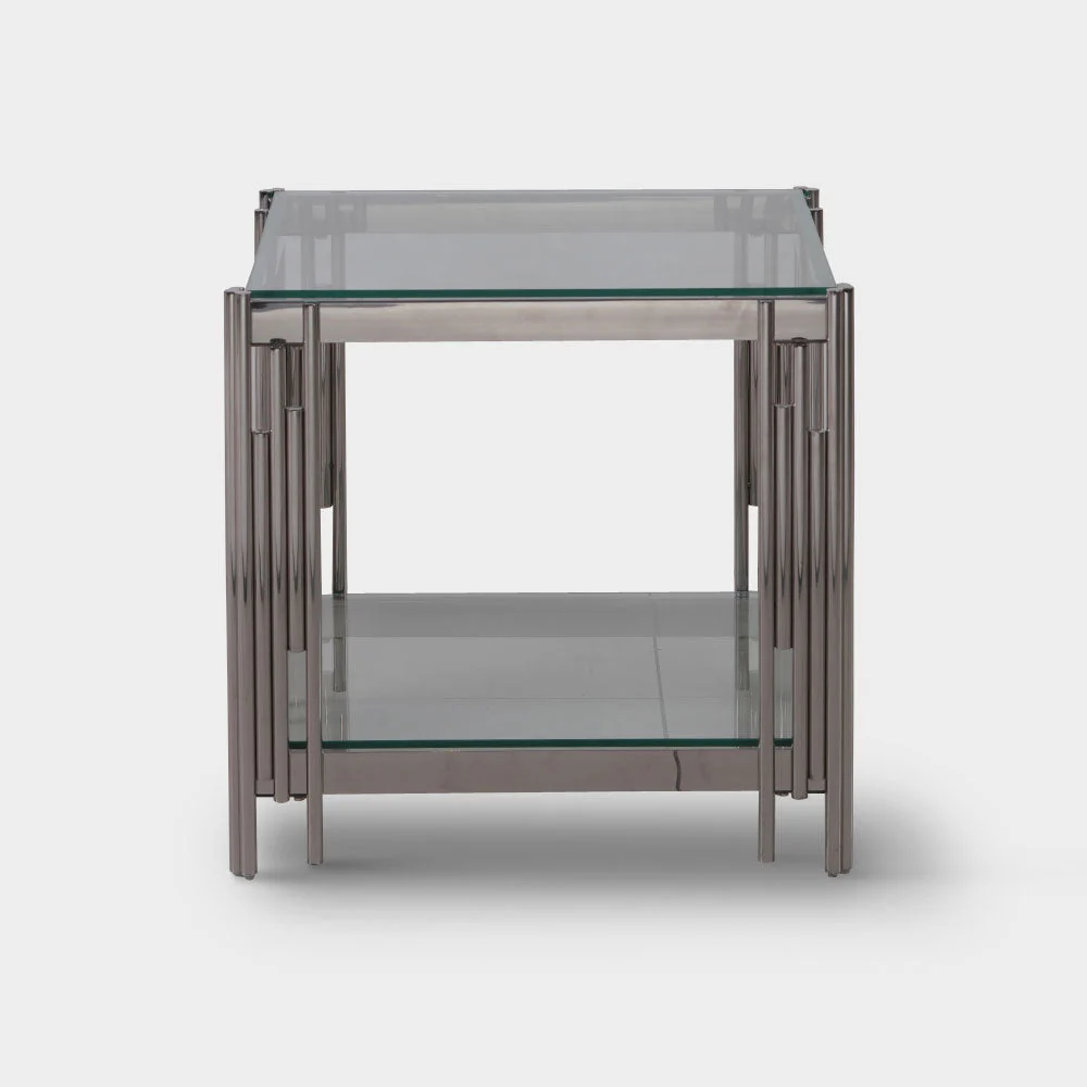 A Modern Contemporary take on an art deco inspired side table. Clear tempered glass top with metal chrome legs in silver finish.