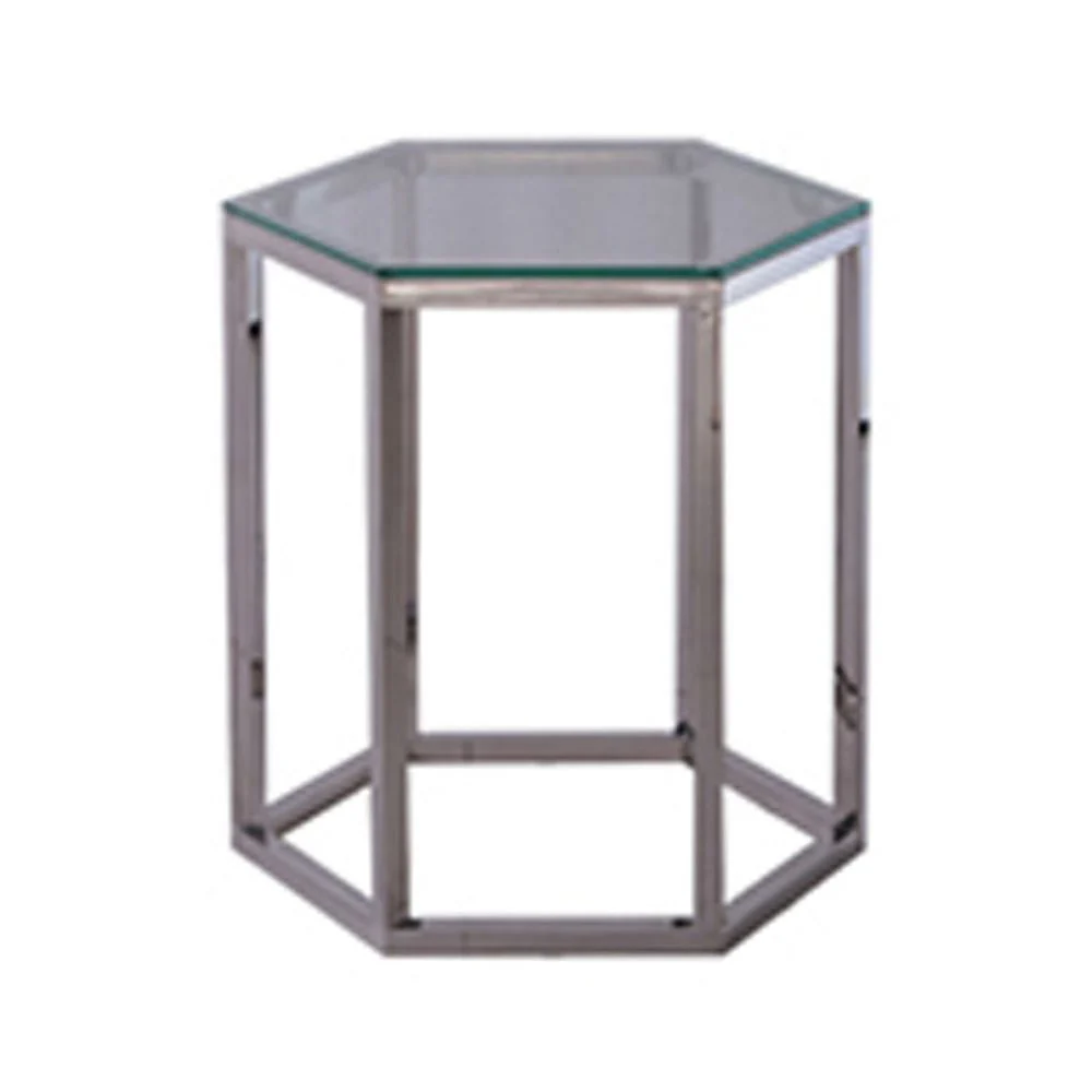 A Modern Contemporary hexagonal side table clear tempered glass with metal chrome legs in silver finish.