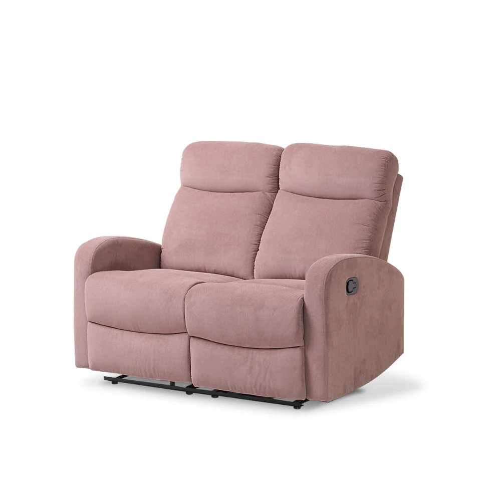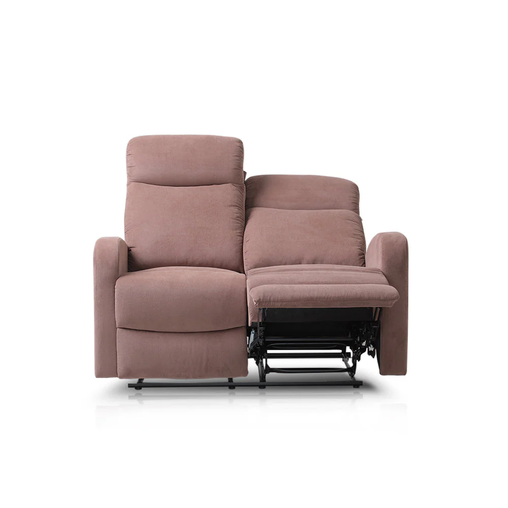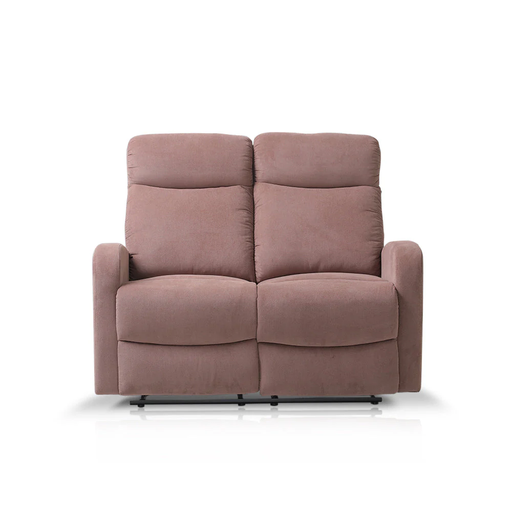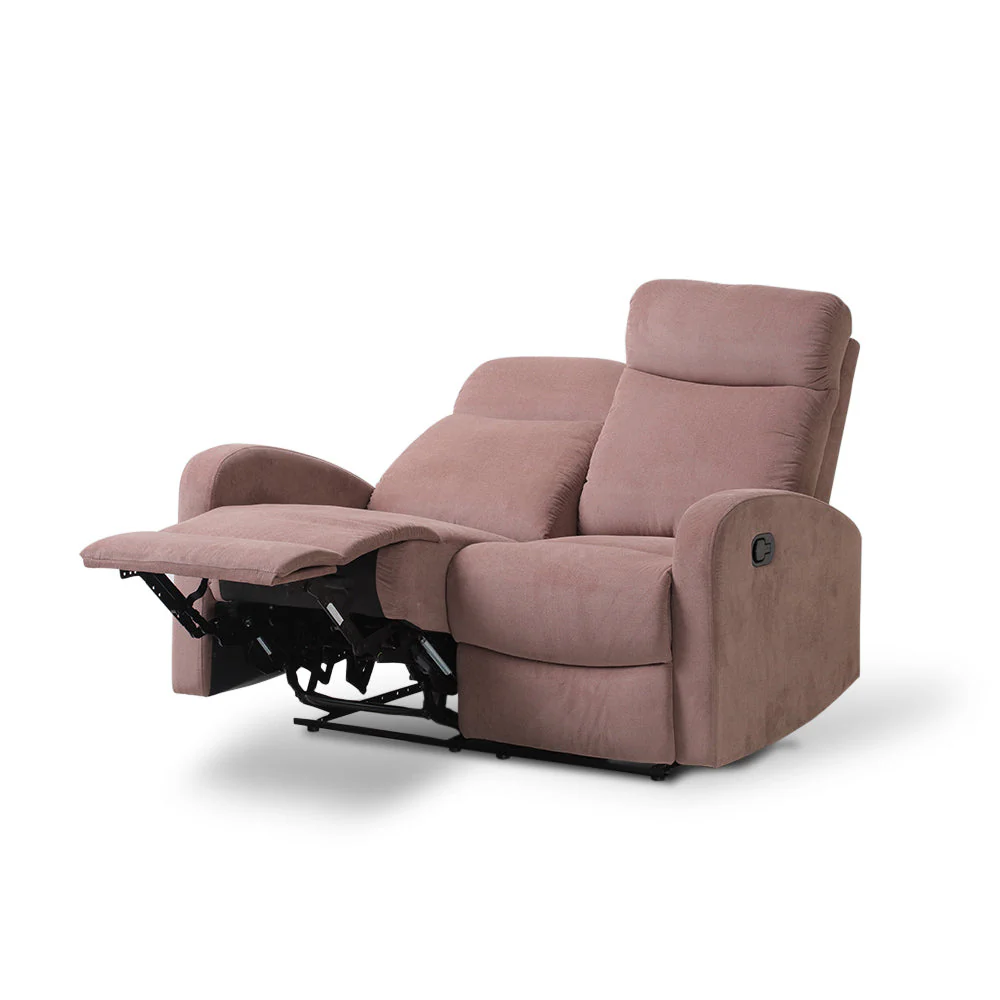 A Modern Contemporary style 2 seater recliner made with solid wood and plywood framing, fully padded and upholstered in fabric, features coil spring seats and manual reclining mechanism.