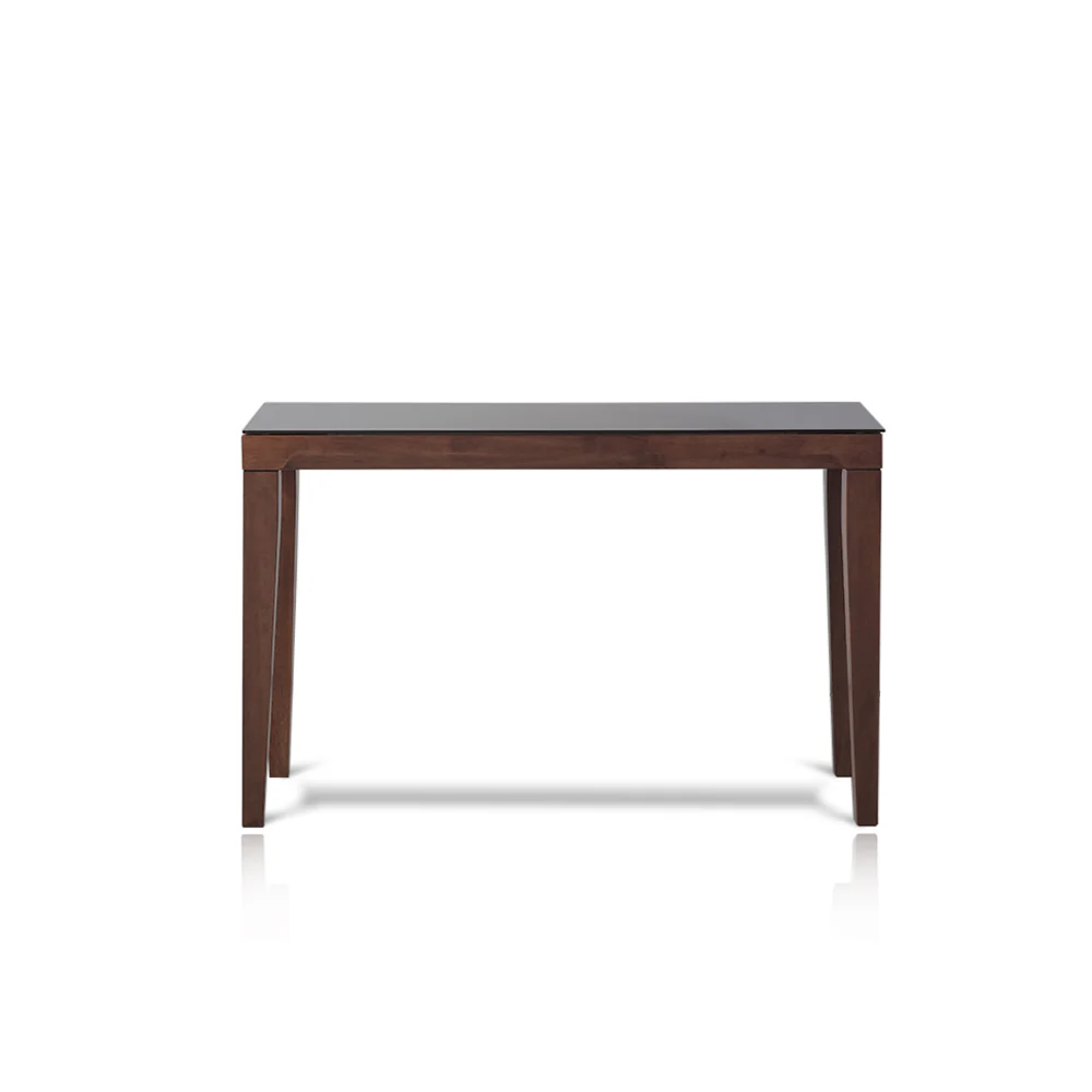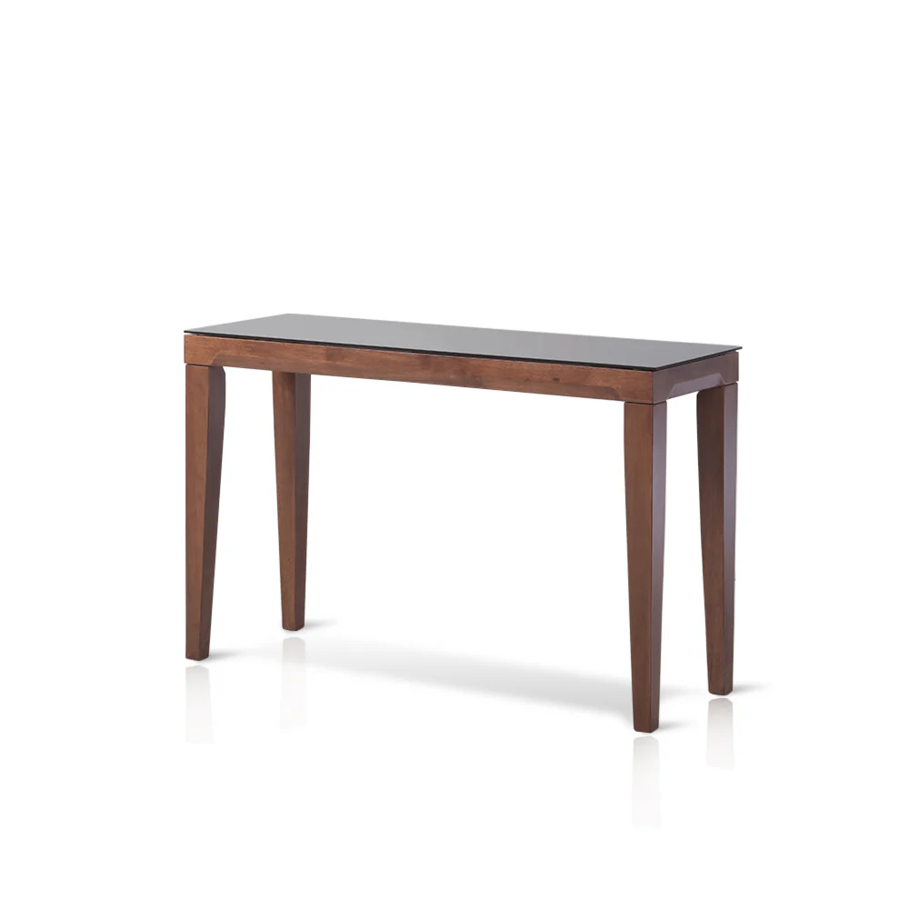 A Modern Classic Style console table made from solid rubberwood with brown colored tempered glass table top.