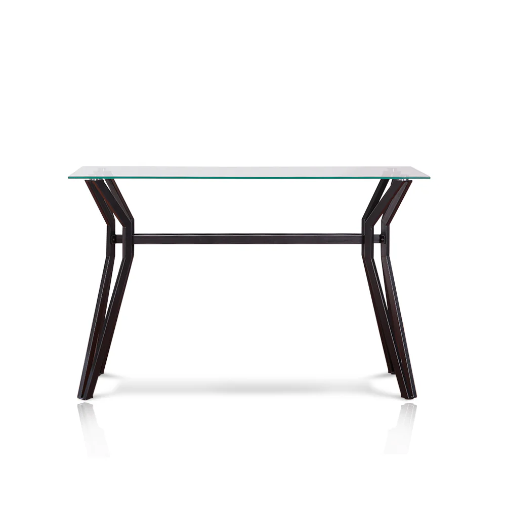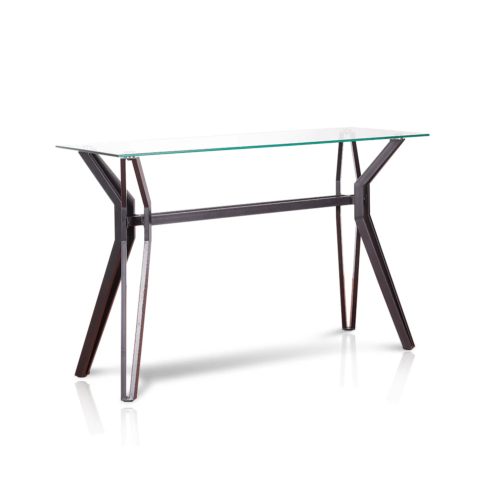 A Modern Contemporary style console table with black tempered glass top and black metal powder coated legs