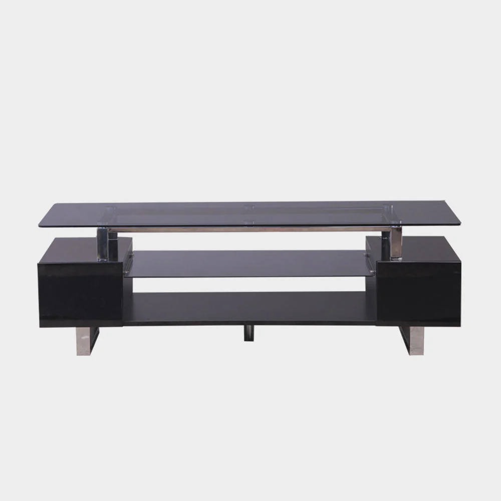 A Modern Contemporary tv stand with glass top, sliding drawer and open shelf MDF board in high gloss finish with tempered glass top.