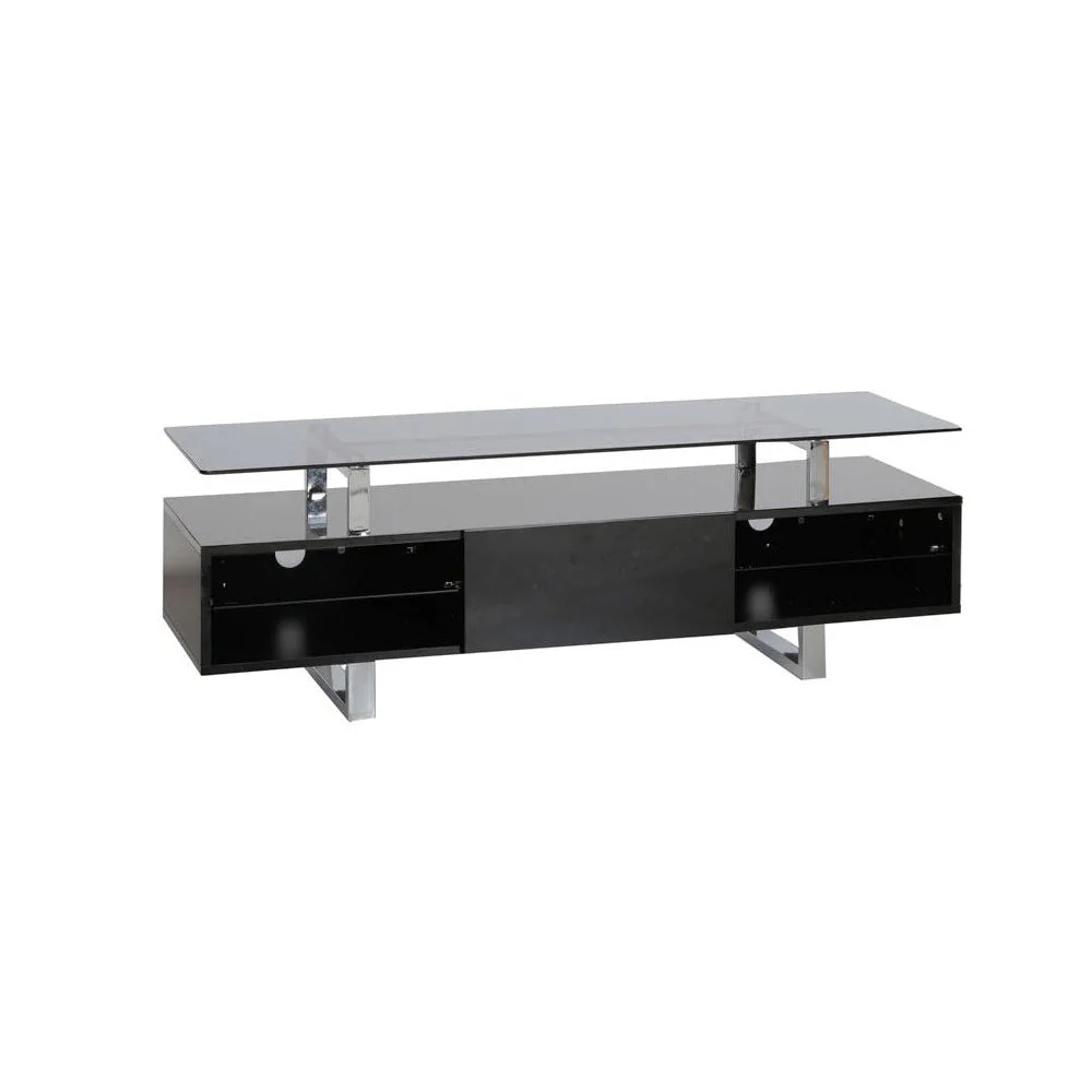 A Modern Contemporary TV stand with smoked tempered glass top, MDF board body in poly-gloss finish and metal legs in chrome finish.