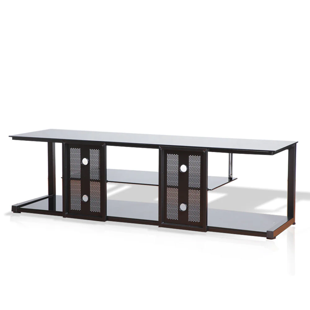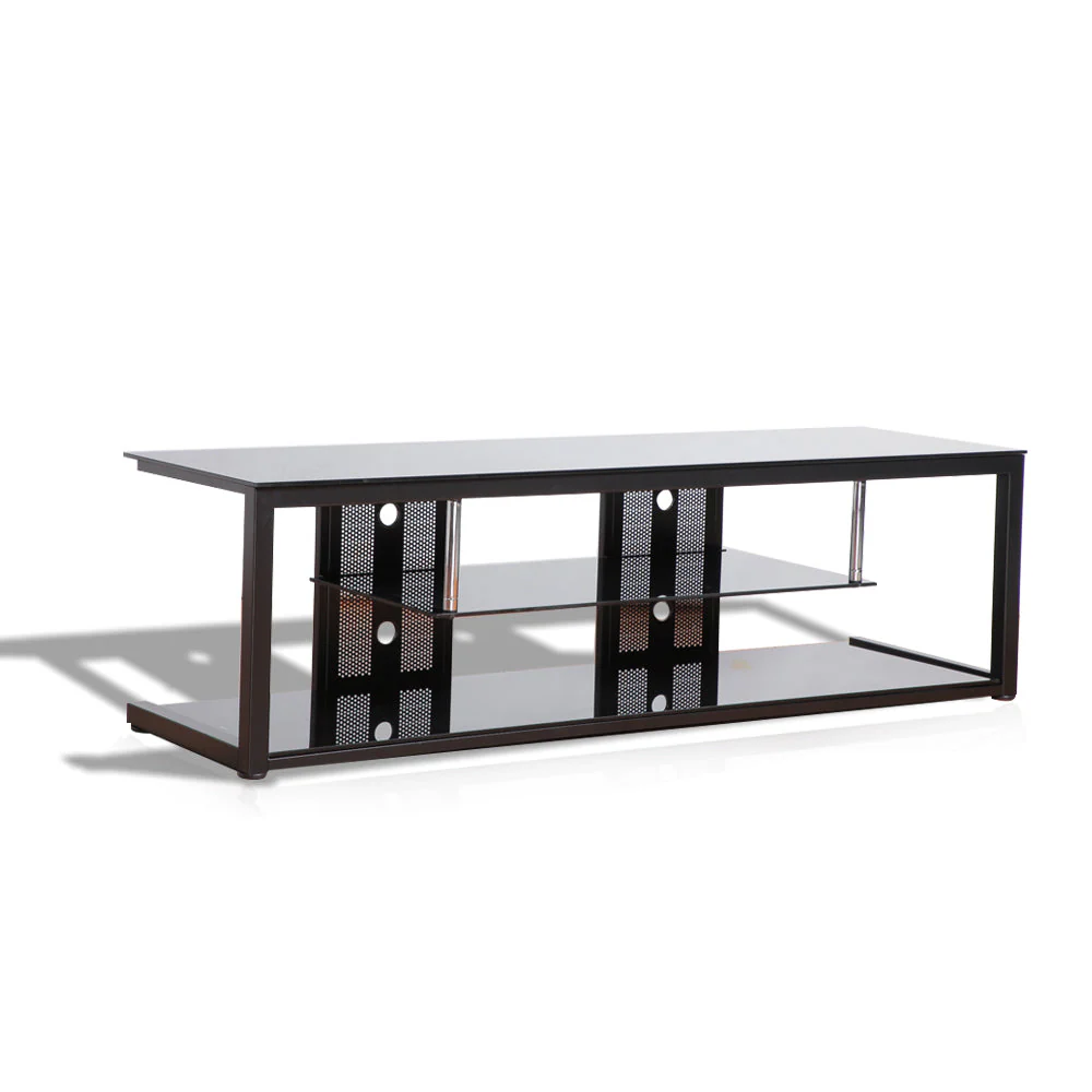 A Modern Contemporary style TV stand made from metal in powder coated finish with black tinted tempered glass shelves.
