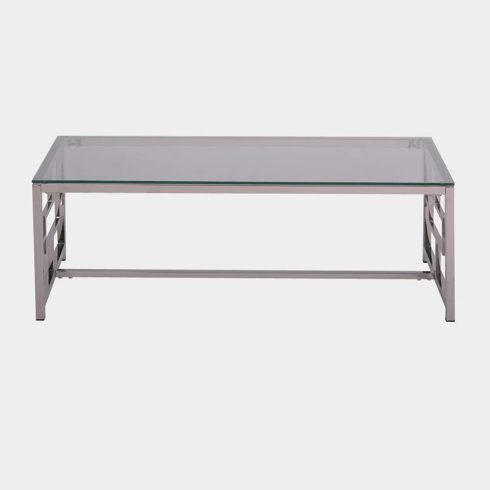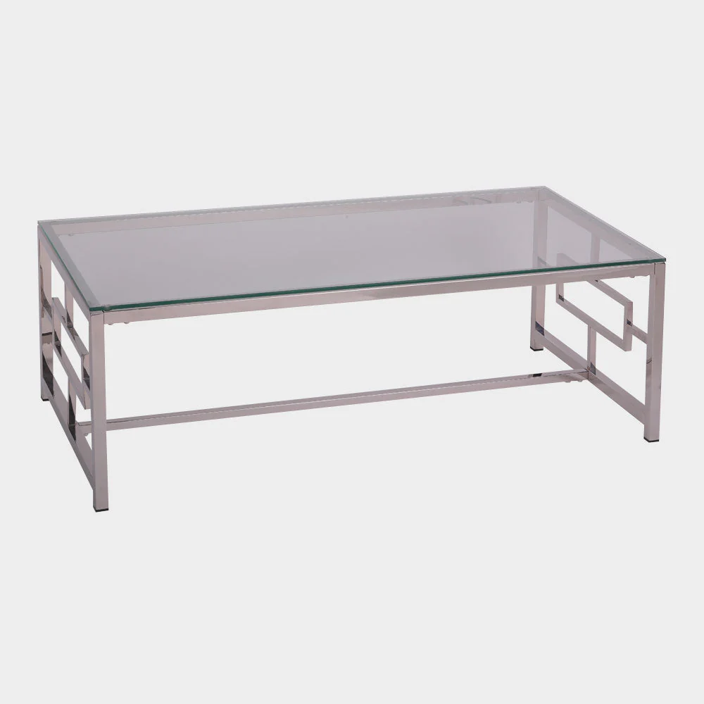 A Modern Contemporary center table inspired by a lattice pattern. Clear tempered glass with metal chrome legs in silver finish.