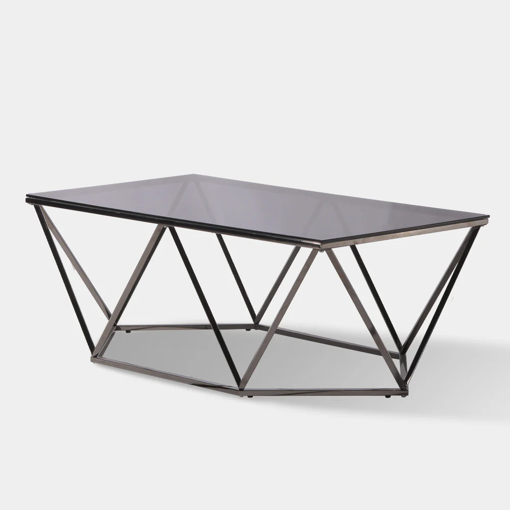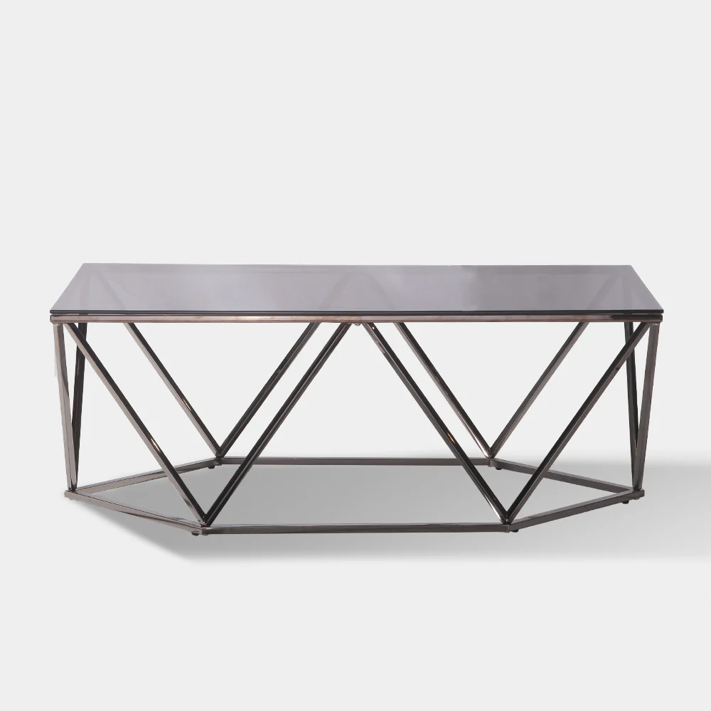 A Modern Contemporary style center table made with polished stainless metal legs and smoke tempered glass table top.