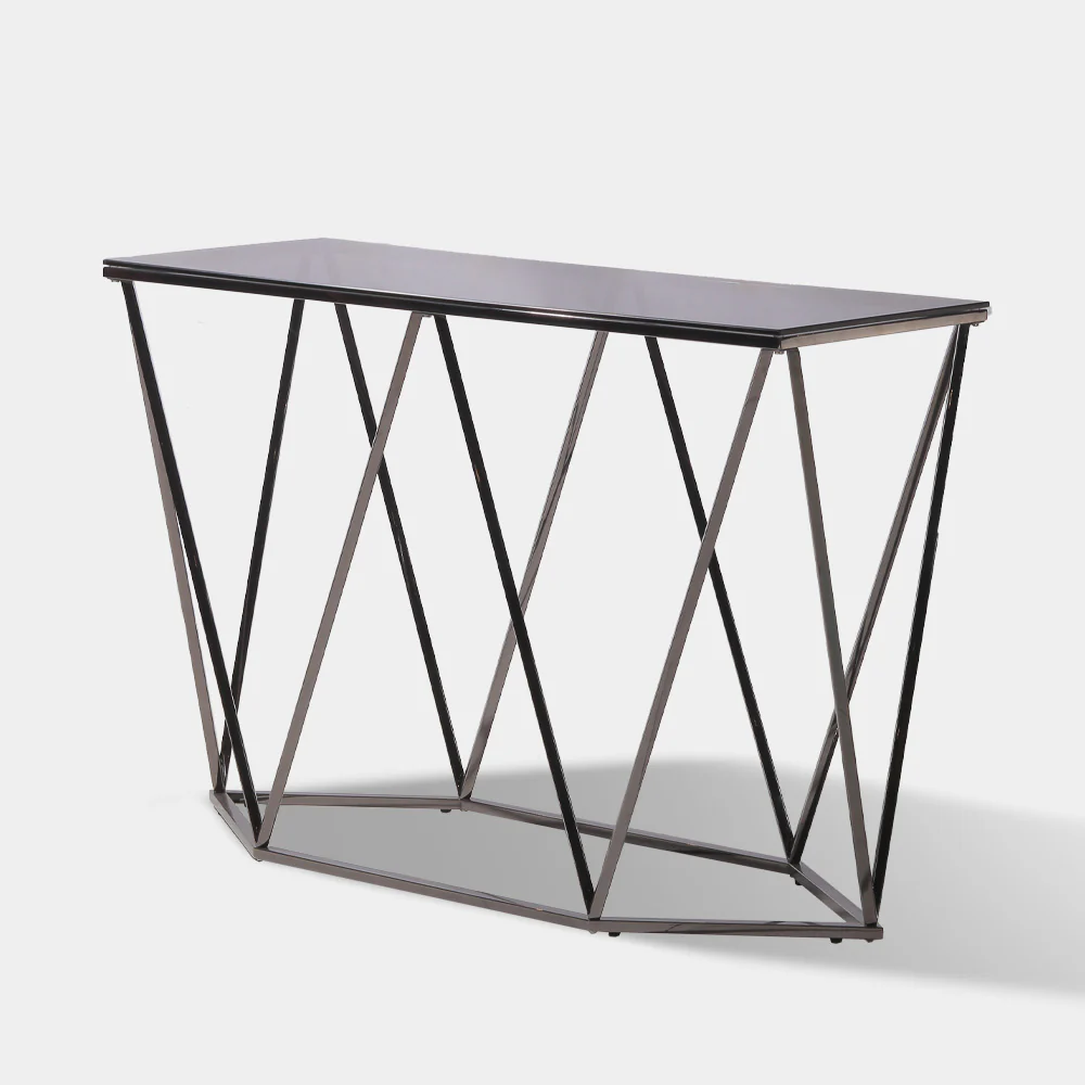 A Modern Contemporary style center table made with polished stainless metal legs and smoke tempered glass table top.