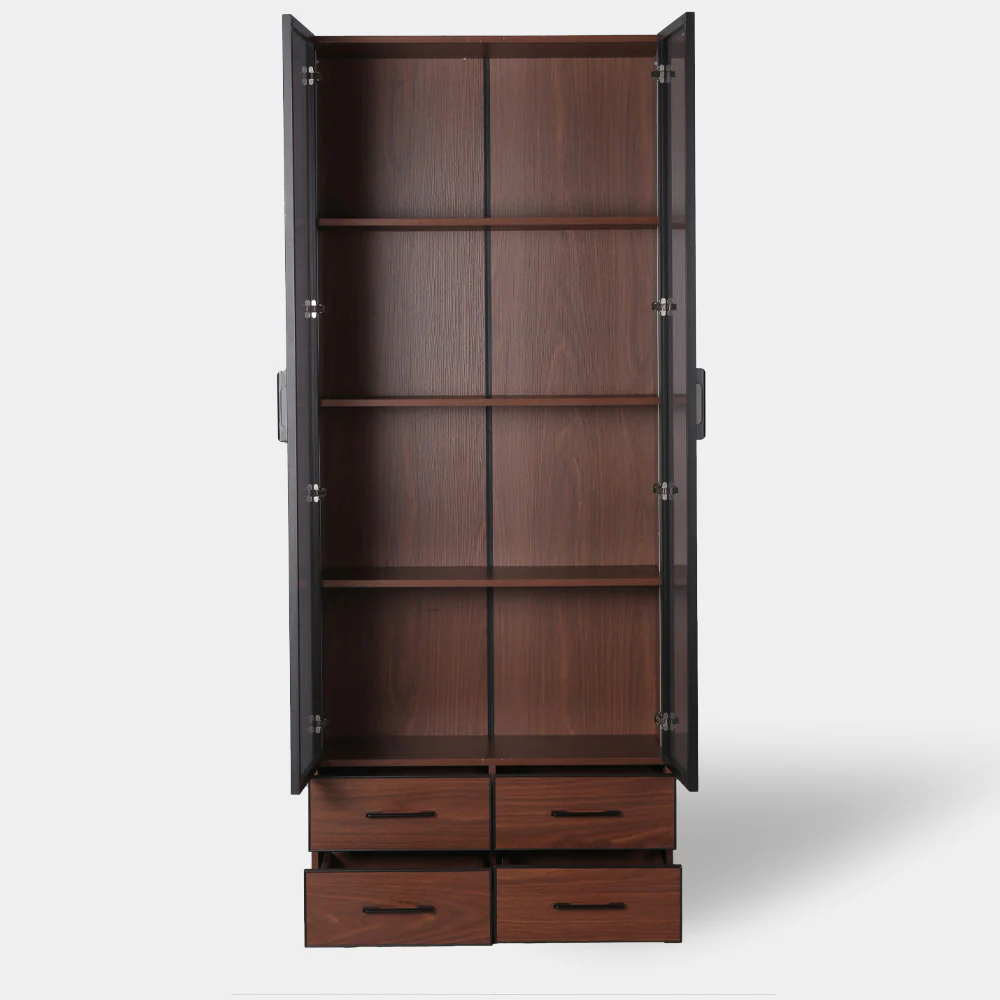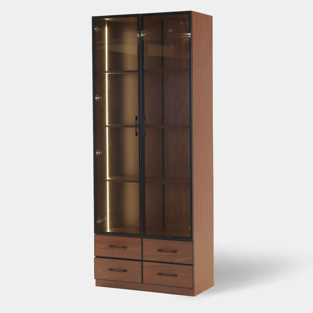 A Modern Contemporary style display cabinet with 2 swing doors and 4 drawers, frame is made from MDF in melamine finish, with 2 tempered glass doors